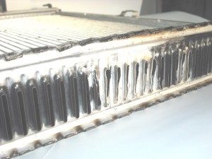 Electrolysis or ‘stray current’ caused this corrosion. Have a look at the ends of the tubes and see how they have been corroded away by stray electric current running through the radiator. This was a radiator from a BMW and was only 6 months old.